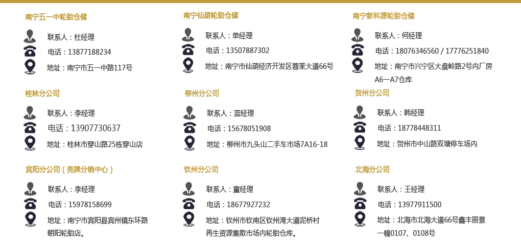 本公司是廣西區(qū)內(nèi)的輪胎批發(fā)及零售商,獨(dú)家代理世界及國內(nèi)眾多知名品牌輪胎:德國大陸馬牌輪胎(世界第四品牌),美國庫珀輪胎(世界第八品牌)杭州中策朝陽(中國第一品牌),杭州中策好運(yùn)(中國第二品牌),無錫紅豆、赤兔馬、千里馬,等品牌。在廣西區(qū)內(nèi)有眾多集團(tuán)客戶,主要為中國鋁業(yè)股份有限公司平果分公司、廣西晟宇通物流有限公司、南寧市平樂行物流有限公司、柳州恒達(dá)巴士股份有限公司、廣西欽州國際集裝箱碼頭有限公司、廣西盛達(dá)混凝土有限公司、火車站物流車隊、區(qū)內(nèi)部分快運(yùn)車隊等的輪胎專用供應(yīng)商。多年以來,被南寧市工商局授予“誠信?維權(quán)承諾單位”、“消費(fèi)者信得過單位”以及“南寧市第一次全國經(jīng)濟(jì)普查先進(jìn)集體單位”。